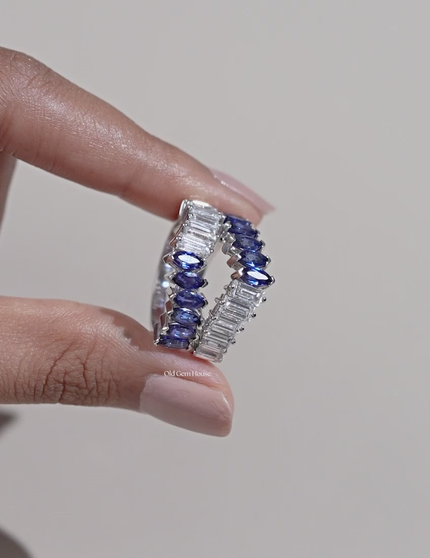 Discover the timeless elegance of the Wedding Band Collection by Old Gem House . This captivating band is crafted in 14K white gold and features 3.00 TCW of marquise-cut sapphire gemstones , beautifully paired with 2.10 TCW of EF/VS baguette-cut lab-grown diamonds. The vintage-inspired design makes it a perfect choice for special occasions, blending deep sapphire tones with clean diamond lines to create a striking, night-worthy statement. An heirloom-quality piece for those who appreciate true craftsmanship and distinctive style.