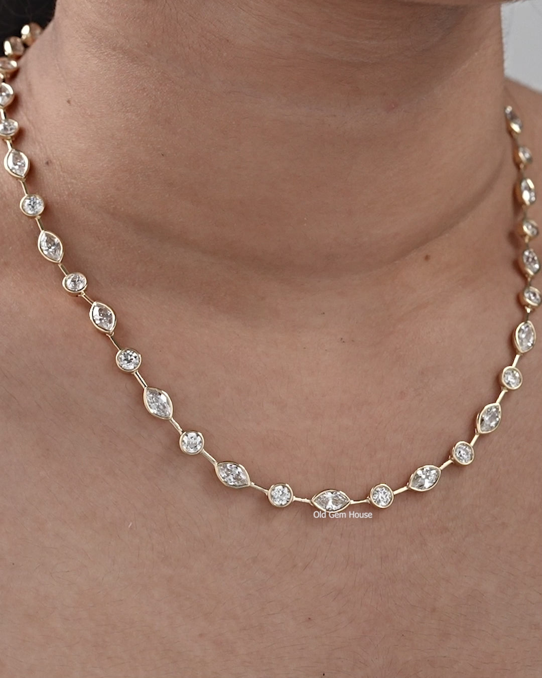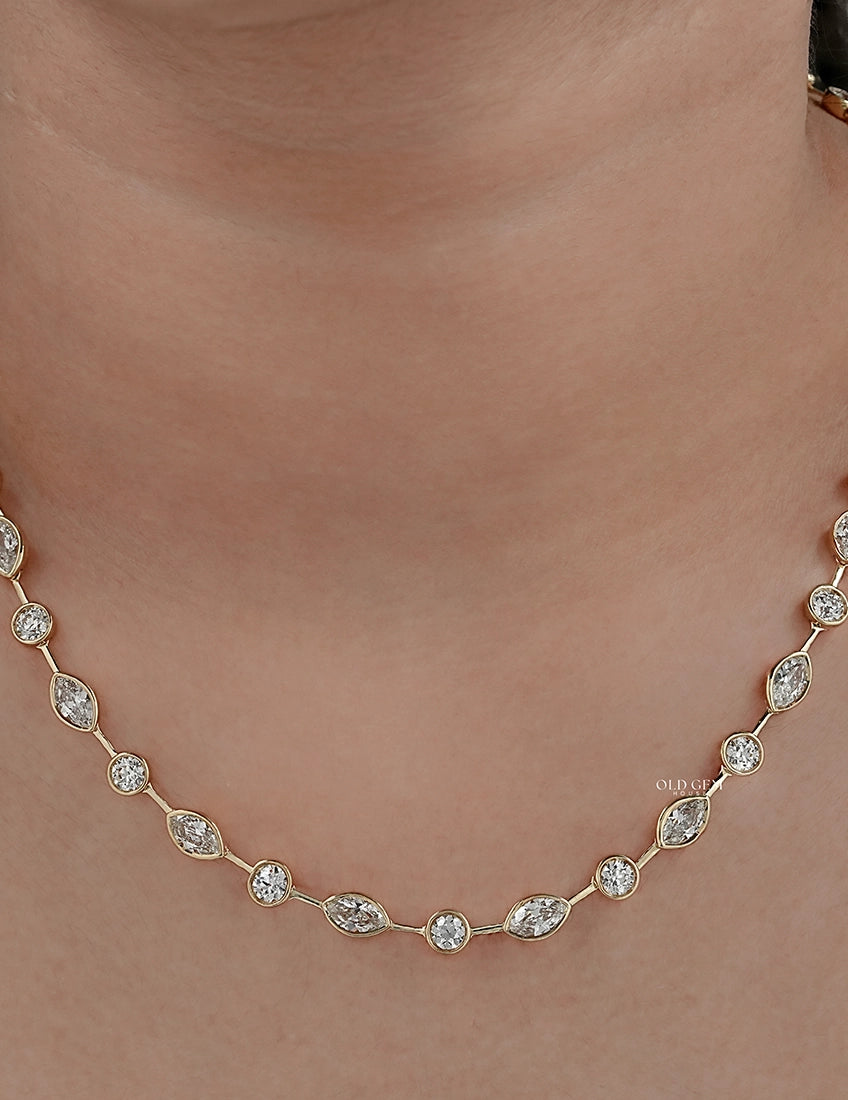 Old Gem House presents this exquisite Old Mine Marquise and OEC Round Bezel Set Necklace, showcasing diamonds of EF color and VS clarity for captivating brilliance. Crafted in 14K Yellow Gold, this elegant wedding necklace embodies timeless elegance and exceptional craftsmanship — a perfect expression of everlasting love and refined style.