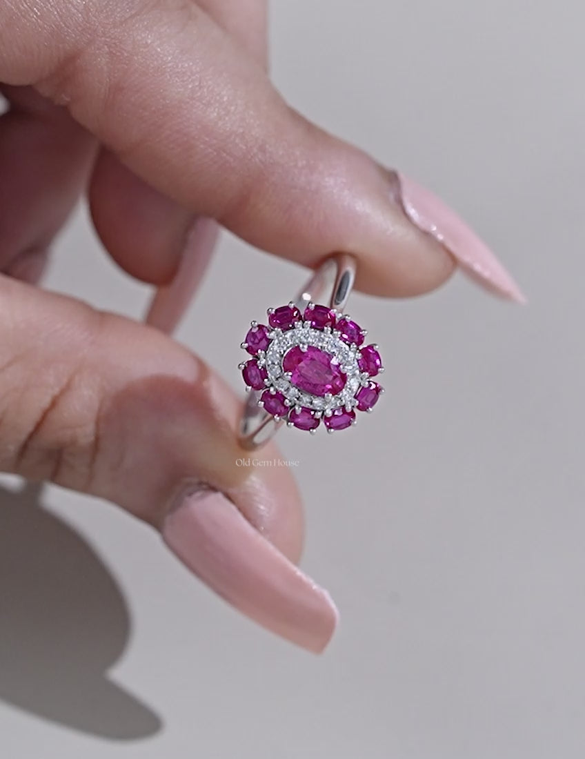 Old Gem House presents this stunning Pink Ruby Oval Lab Gemstone Halo Engagement Ring. Designed in a brilliant halo setting and crafted in elegant 14K white gold, this ring showcases exceptional sparkle and timeless beauty. A perfect engagement gift for wife, this luxurious diamond ring is ideal for celebrating love and commitment.