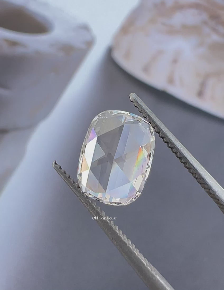 The Old Gem House reveals a stunning 1.65 carat Rose Cut Cushion lab-grown diamond, expertly crafted to showcase its delicate rose-cut facets and soft, rounded edges. With exceptional EF color and VS clarity, this diamond exudes a romantic glow and vintage charm. An exquisite choice for a bespoke engagement ring or a unique heirloom piece, this timeless gem perfectly blends antique elegance with modern ethical craftsmanship.