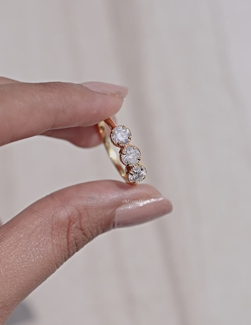 By The Old Gem House – 1.10-Carat Lab-Grown Diamond engagement ring showcasing a stunning OEC Round cut center stone with dazzling EF color and eye-clean VS clarity. Complemented by OEC Round-cut lab-grown diamonds Totaling 1.10 Carats, this timeless three-stone ring is meticulously crafted in luminous 925 Sterling Silver, With yellow gold plating offering vintage charm with a modern, ethical touch.