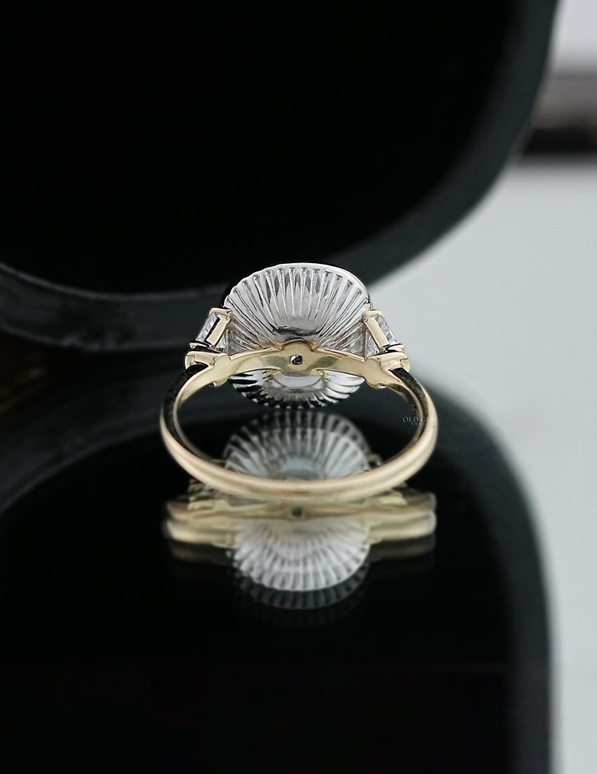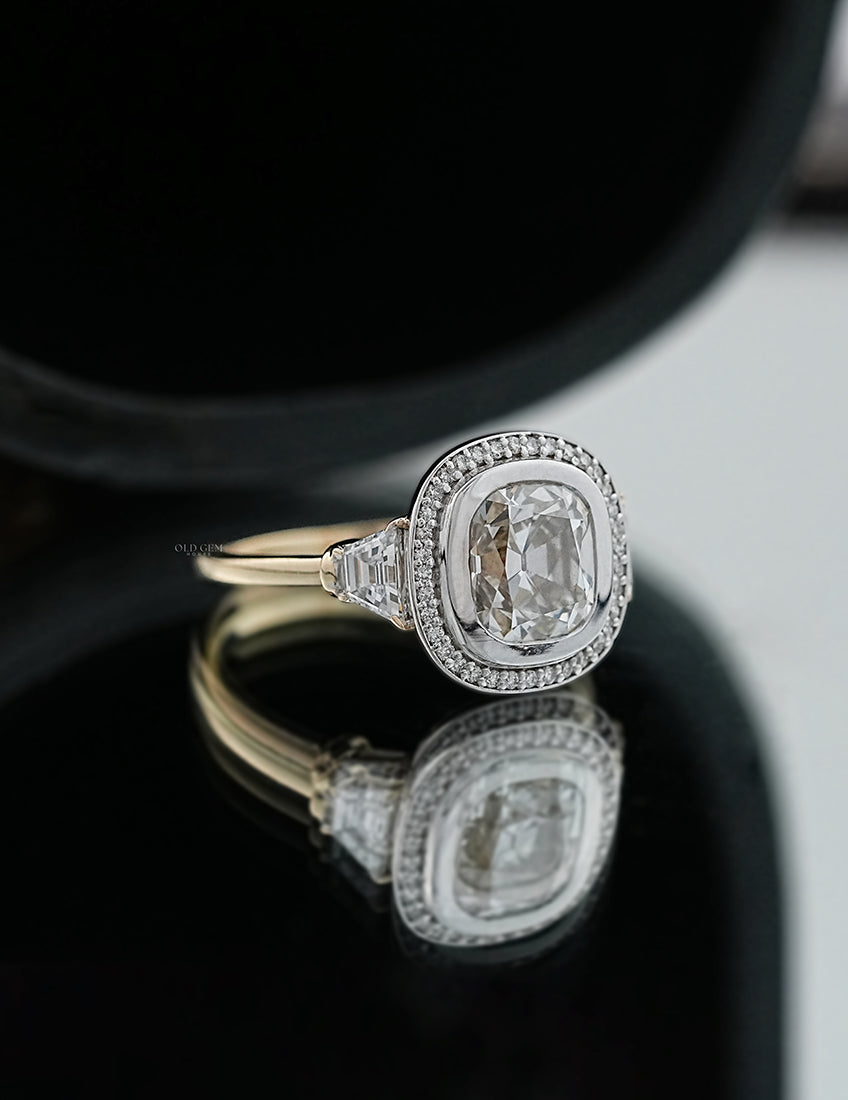A stunning ring by Old Gem House , featuring a 3.00 CT old mine cushion lab diamond with EF/VS clarity in a bezel setting. It’s surrounded by a halo of tiny round diamonds (0.20 TCW, EF/VS clarity) and accented with 0.55 TCW step-cut trapezoid side diamonds. Made with solid 10K gold , this ring offers a rich, elegant look—perfect for special occasions.
