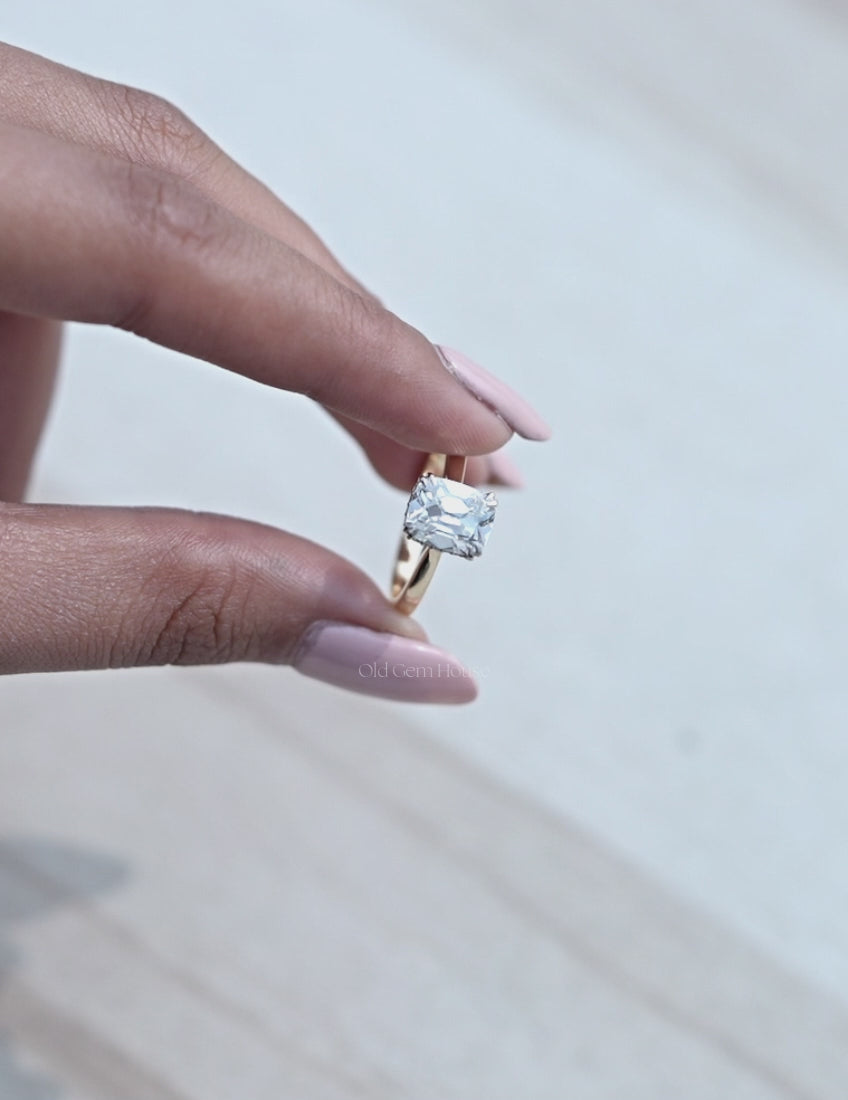 A 2.10-Carat Lab-Grown Old Mine Cushion Cut Diamond in EF color and VS clarity serves as the center stone, accented by a delicate 0.10-Carat Total Weight Round Lab-Grown Diamond and a hidden halo setting. This engagement ring is crafted in 14KT Yellow Gold by Old Gem House.